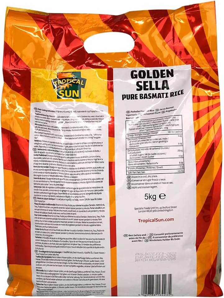 Experience the rich and authentic taste of our Tropical Sun Golden Sella Rice. This pack of 1 contains 5kg of golden sella basmati rice, known for its superior quality and exceptional flavor. Parboiled to perfection, our golden sella basmati rice retains its firm texture and cooks evenly.